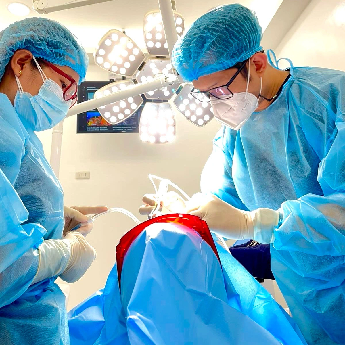 A detailed photo of oral surgeons wearing protective gowns, masks, and gloves while performing a dental implant procedure at Affinity Dental Clinics Cebu. The scene highlights the clinic’s advanced facilities, surgical expertise, and commitment to safe, high-quality implant dentistry for patients in Cebu and the Visayas region.