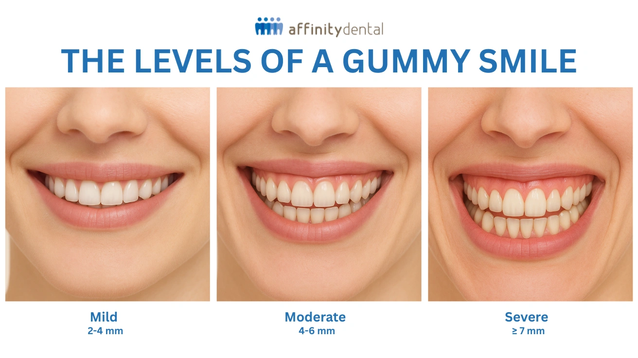 Educational infographic from Affinity Dental Clinics showing three side-by-side examples of gummy smiles. Mild gummy smile displays 2–4 mm of gum exposure, moderate shows 4–6 mm, and severe presents 7 mm or more. Designed to help patients understand the different levels of gummy smiles.