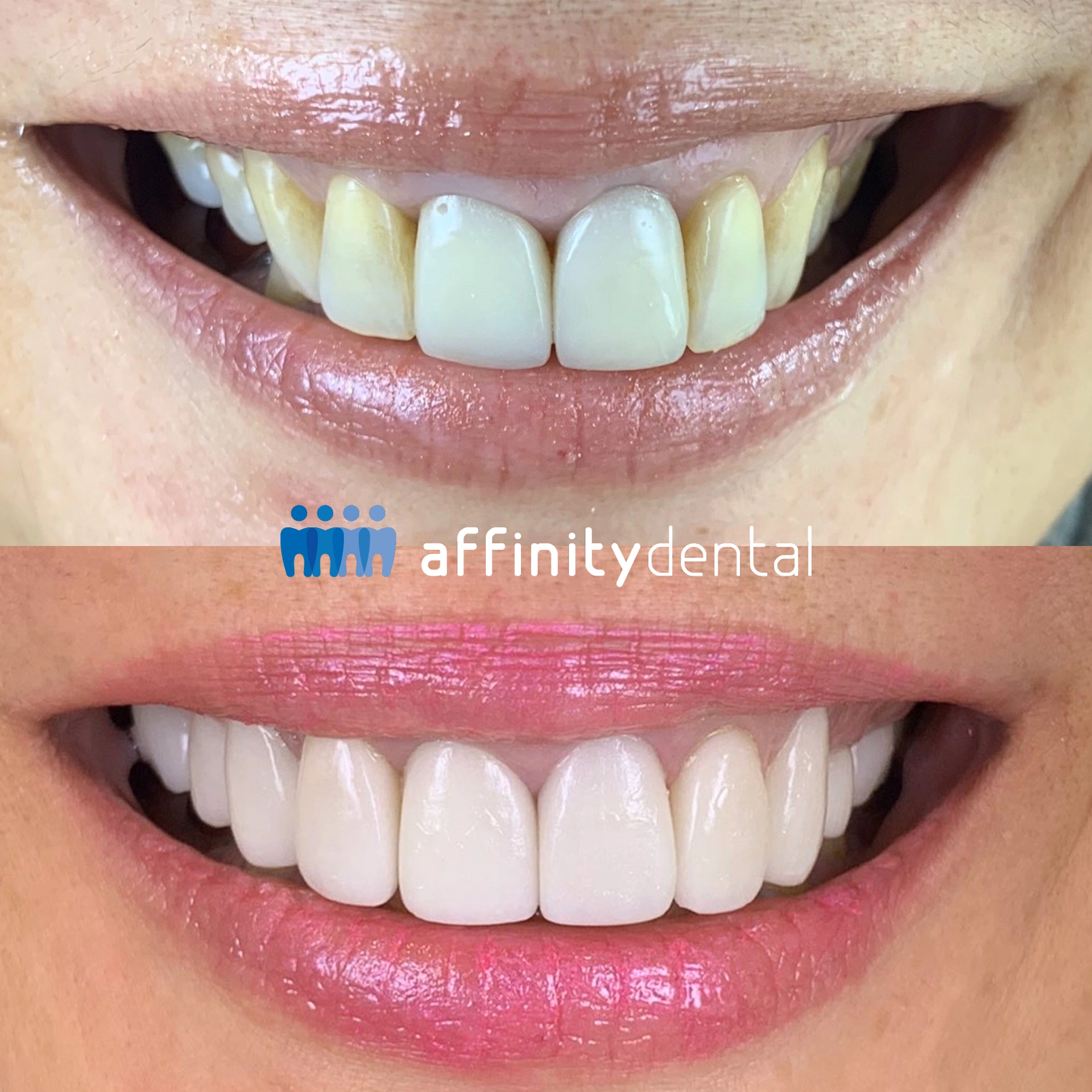 This smile transformation at Affinity Dental Clinics Makati involved replacing old Porcelain-Fused-to-Metal (PFM) crowns on the central incisors with modern Zirconia Crowns, while placing porcelain veneers on the adjacent teeth. PFM crowns often cause mismatched color and dark margins over time. By combining zirconia crowns with porcelain veneers, and leveraging our in-house dental laboratory for real-time customization, we achieved consistent shade, natural translucency, and improved overall smile harmony.