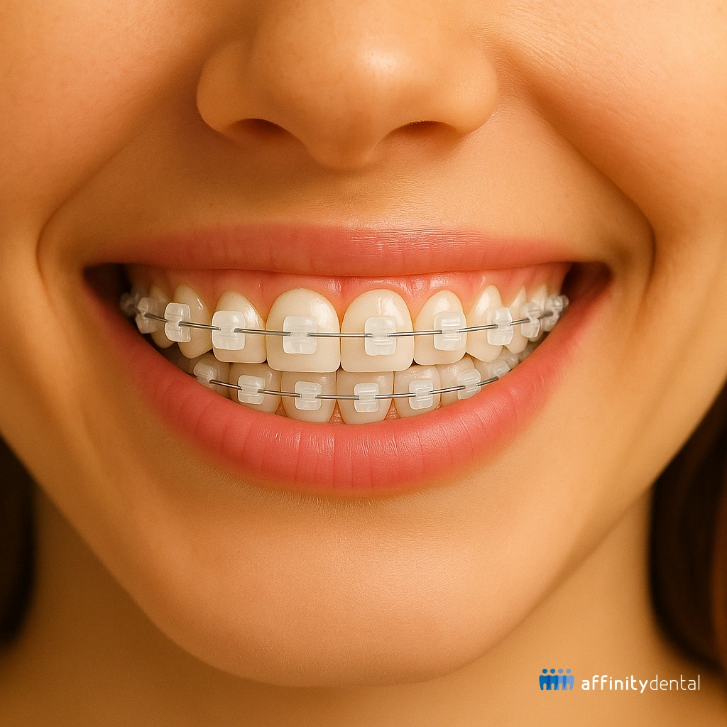 A hyper-realistic 3D generated image showing Damon ceramic self-ligating braces on teeth. These braces combine the aesthetics of clear brackets with the advanced technology of self-ligating systems, offering patients a less noticeable and more comfortable orthodontic treatment option compared to traditional braces. The illustration highlights the transparent ceramic brackets designed to blend with natural teeth.