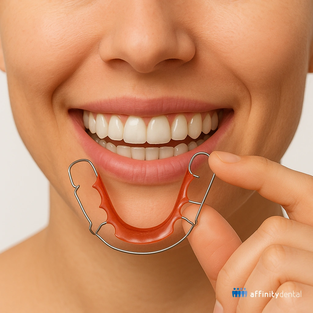 This image shows a patient smiling while holding a Hawley retainer, a reliable orthodontic appliance made from a molded acrylic base and a stainless steel labial wire. Hawley retainers are adjustable and known for their longevity, making them an excellent choice for maintaining alignment after braces. Available at Affinity Dental Clinics across the Philippines, they are custom-fit for both teens and adults.