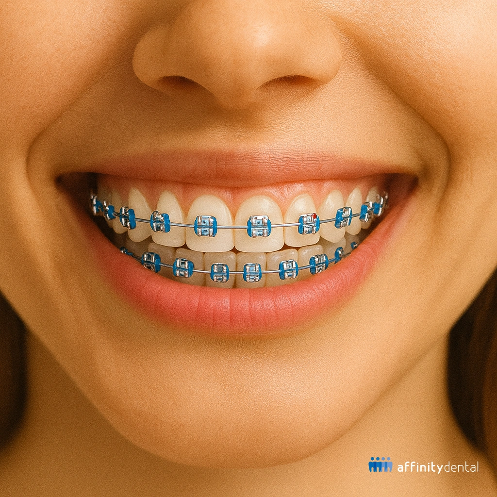 Close-up image of a patient smiling with traditional metal braces featuring blue elastics. Metal braces remain one of the most reliable orthodontic treatments, moving teeth safely with brackets and wires under expert supervision. Properly planned and maintained braces ensure long-term oral health and function.